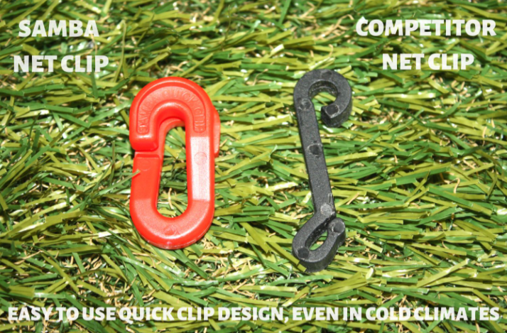 Supplied with original Samba quickclips (manufactured in the UK). These clips are very efficient when securing the net on or off, even in cold climates.