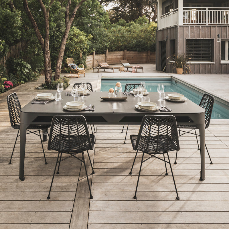 A genuine piece of designer furniture, the Hyphen will sublimate your outside spaces with its sleek lines and noble materials. More than a pool table, it can very easily be converted into a garden dining table. Either stone or wood appearance: it’s up to you to choose the finish that will go best with your outside space.